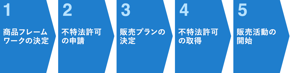 当社にご相談いただいた場合には、下記の流れに沿って進めていきます。スキームの検討から許認可の申請書類の作成、販売ツールや販売活動マニュアルの作成、販売後の運営のアドバイスに至るまで、当社が責任を持ってバックアップいたします。